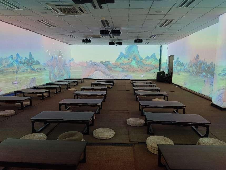教室内设置360度全景投屏,融入多个静态或微动态特定教学场景,利用数字语音、全景影像、三维影像等技术进行互动性教学,不仅适用于现有教学资源的要求,且可在特定教学场景中改革教学方式、创新教学内容。学科在体验教室对面提供数百部珍藏图书以配合教学,让每一名中医学子都有一堂可以与历史对话、与名医对话、与典籍对话、与中药对话、与方剂对话的“最难忘的课”。